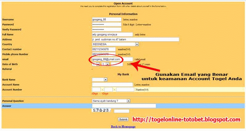 4 Cara Daftar Togel Online Praktis Gratis. Pertama bukalah rekomendasi Situs Togel Online terbaik dari kami yaitu Target4d. Kedua apabila anda telah selesai membuka Situs Togel pilihan kami tadi, maka langkah selanjutnya mengisi form pendaftaran yang sudah disediakan. Seperti username, nama rekening, nomor rekening dan jenis bank. bang togel bandar togel online aman dan sangat terpecaya anda cari bandar togel yang aman dan terpercaya ? proses deposit dan withdraw yang aman dan cepat ?.